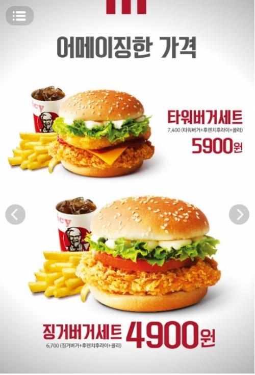 징거버거나 타워버거의 매운 맛 버전을 먹고 싶을 땐 '치즈 징거버거' 와 '더블치즈 타워버거'를 먹으면 됩니다. 근데 징거 패티 자체가 좀 매콤하긴 해요. | ||