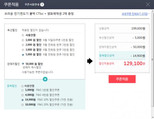 P&G 할인쿠폰 적용하고 추가로 5,000원 할인쿠폰 적용해서 129,1000원 나왔습니다
