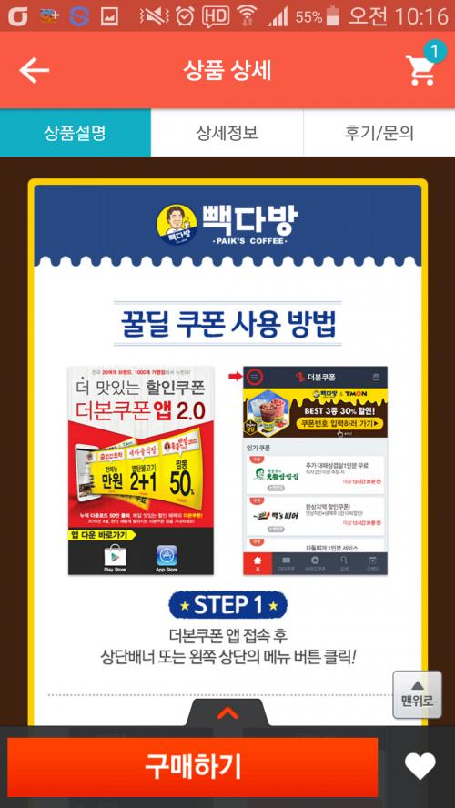 티몬 앱에서만 구매 가능합니다. 쿠폰을 더본 앱에서 받을 수 있다는 거죠. | ||
