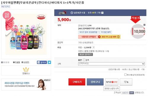 샴푸1+1 2개, 컨디셔너1+1 2개, 바디워시1+1 1개 -> 50,300원