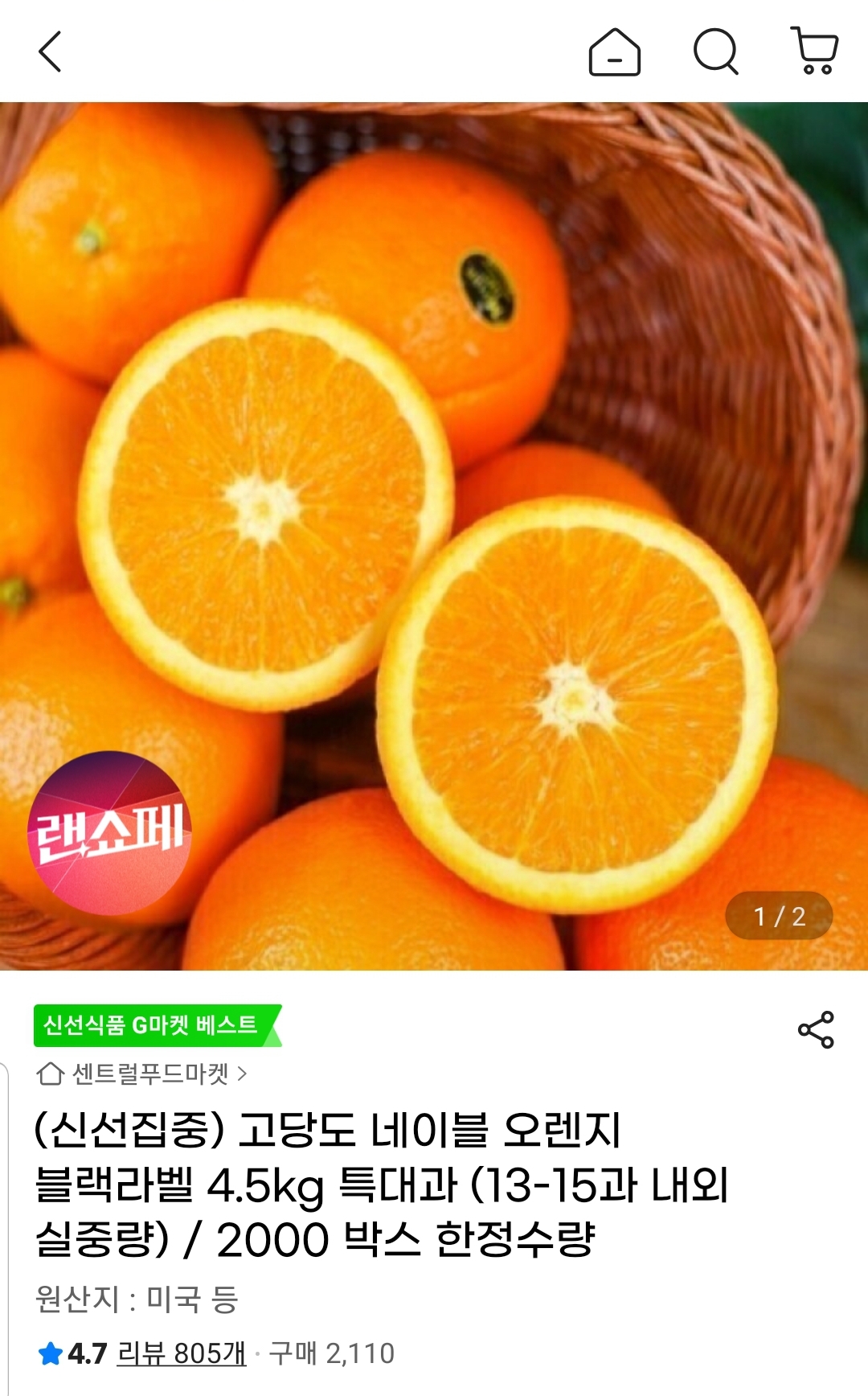 [G마켓] 고당도 네이블 오렌지 블랙라벨 특대과 4.5kg (16,990원/무료)