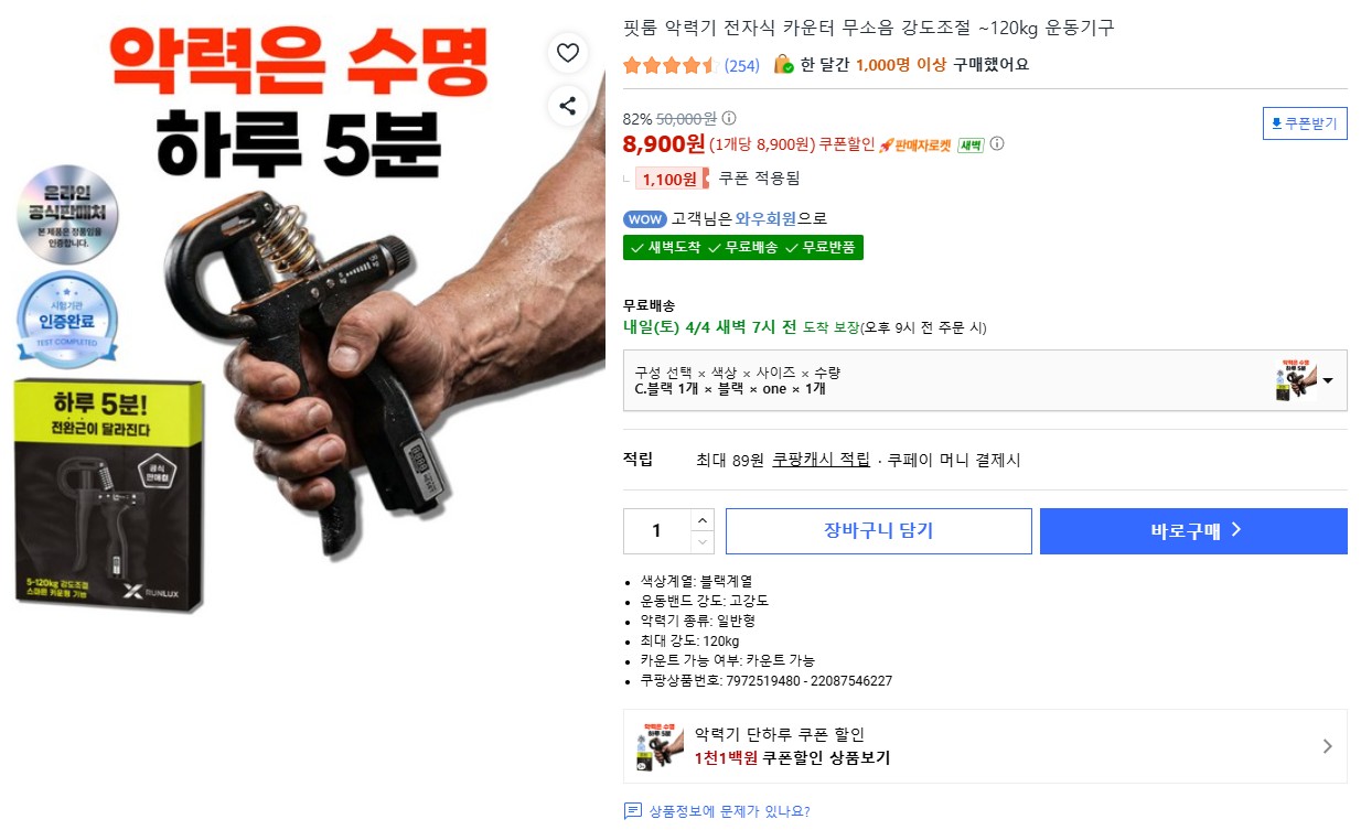 [쿠팡] 핏룸 카운터 강도조절 악력기 (8,900원 / 무료)