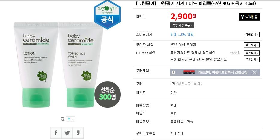 그린핑거 세라마이드 체험팩(로션 40g + 워시 40ml) 2900원