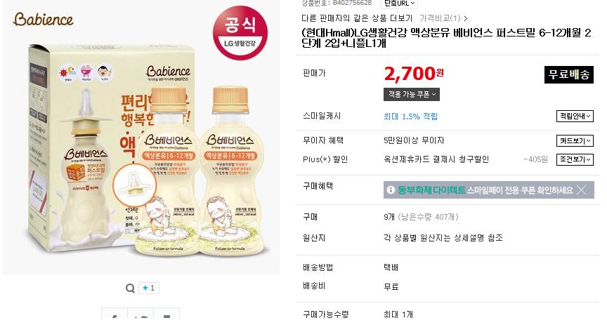 LG생활건강 액상분유 베비언스 퍼스트밀 6-12개월 2단계 2입+니플L1개 2700원