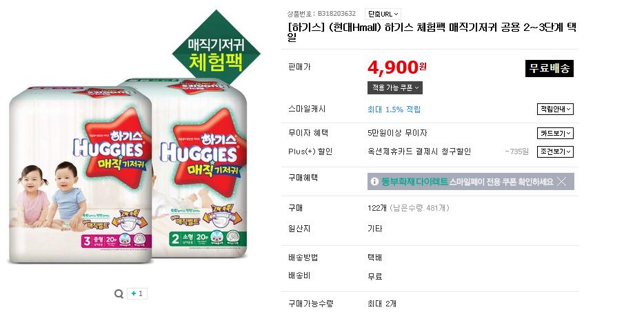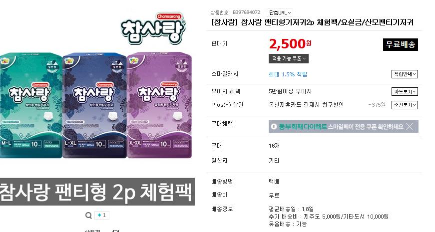 참사랑 팬티형기저귀2p 체험팩 2500원