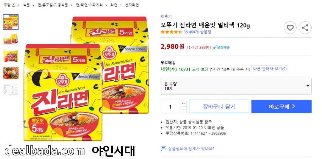 [쿠팡] 진라면 매운맛 10봉지 (2,980원/무료) > 국내핫딜