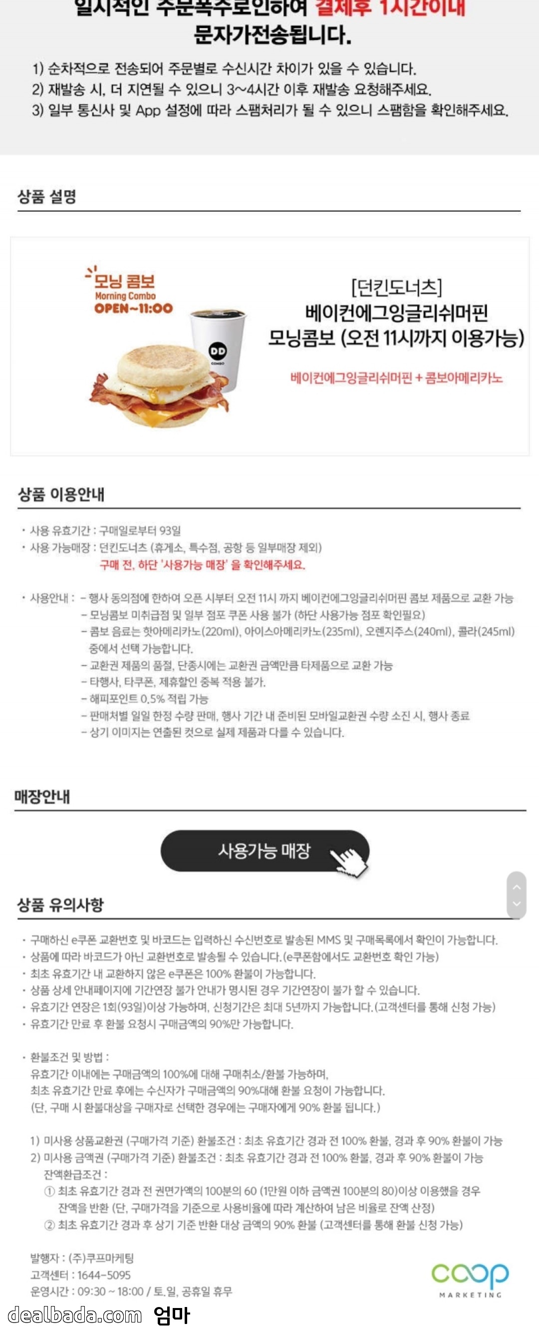 [G마켓]스마일클럽 던킨 베이컨에그 잉글리쉬머핀 콤보(1,900) > 국내핫딜