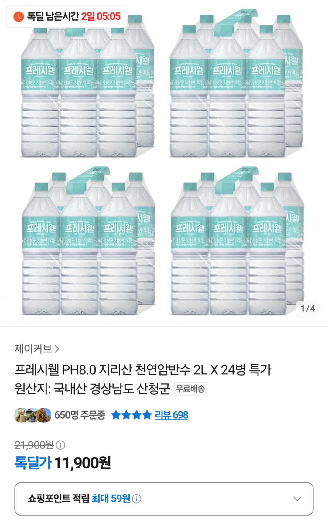 [카카오] 프레시웰 지리산 천연암반수 2L×24병 (11,900원/무료)