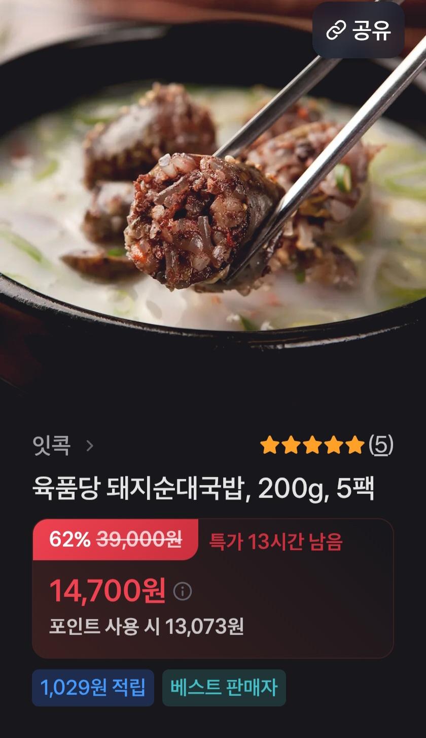 [토스] 육품당 돼지 순대국밥 200g 5팩 (14,700원/무료) > 국내핫딜