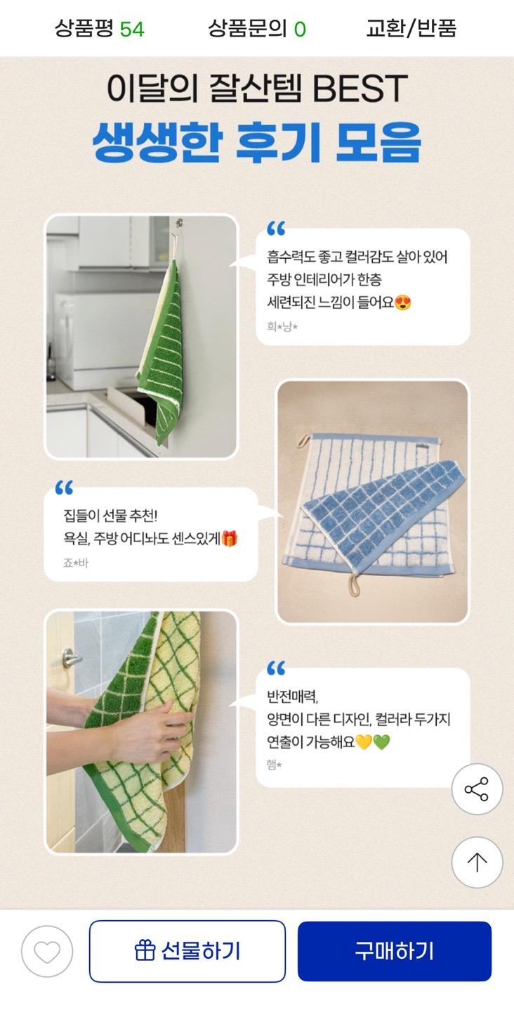 도톰하고 물기 흡수 잘 해서 주방 핸드타올로 쓰기 좋아요