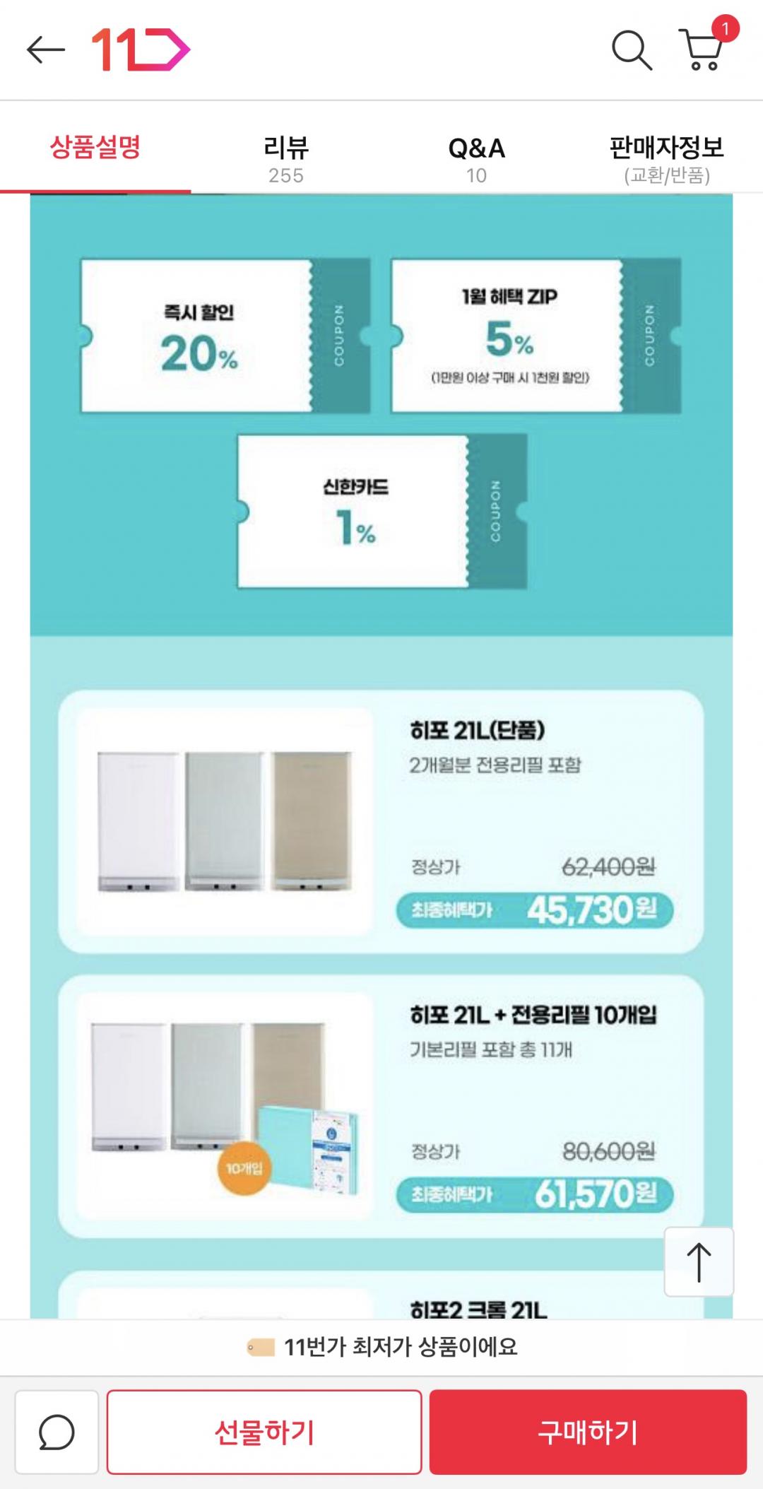 즉시할인+장바쿠폰 적용하면 21L 45,730원나오네요!!