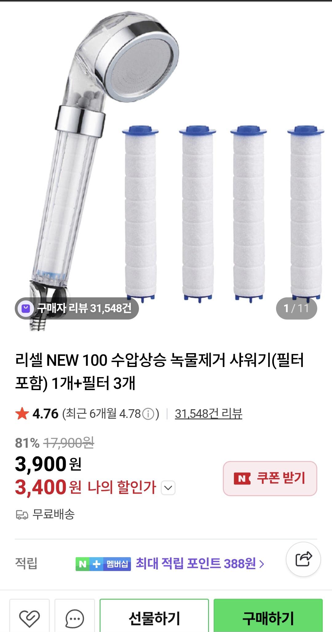 샤워기(필터포함) + 필터 3개 포함 구성에 무배여서 다이소 보다 저렴하네요