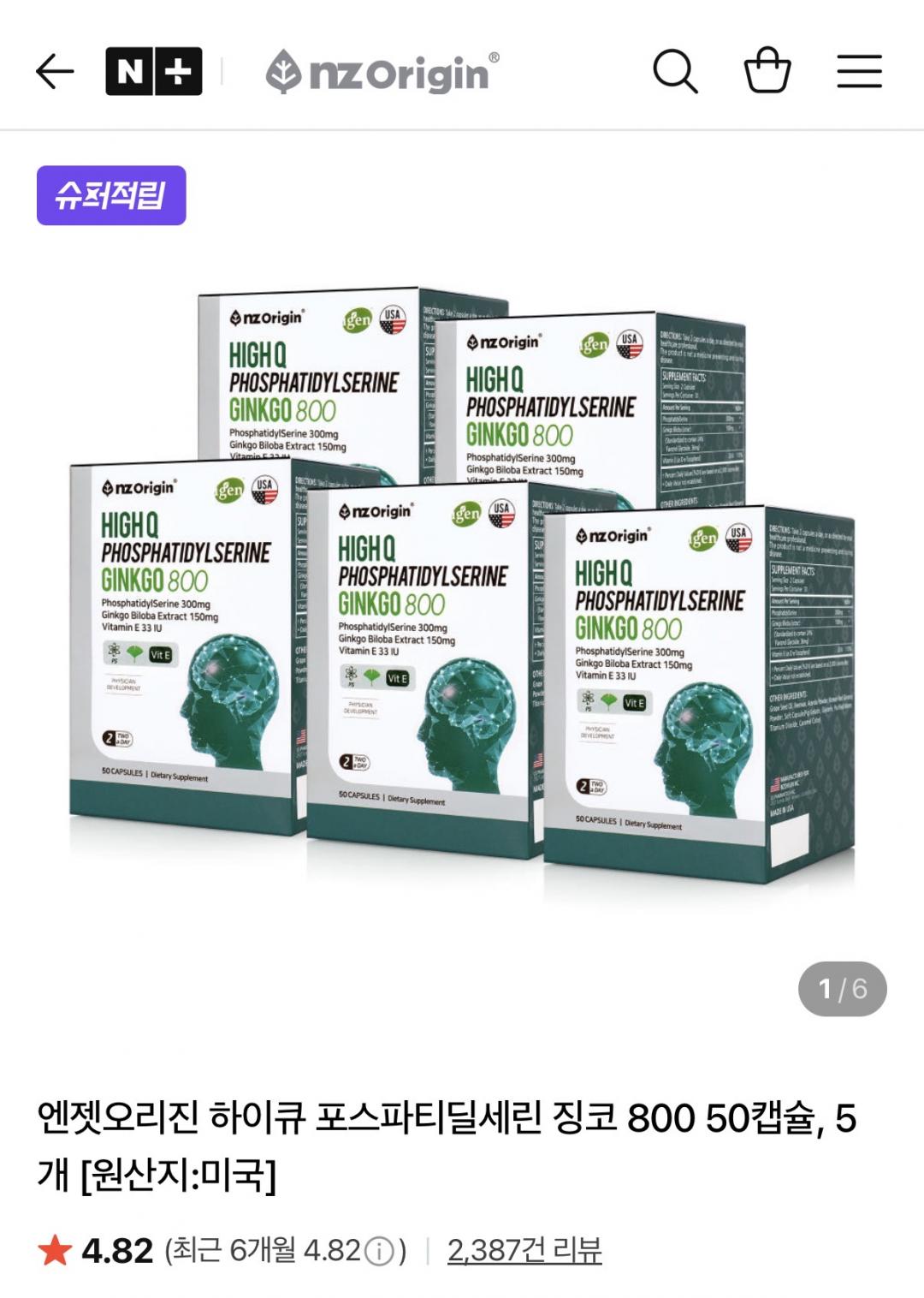 [네이버] 엔젯오리진 하이큐 포스파티딜세린 징코 800 50캡슐 5개 (96,900원/무료)