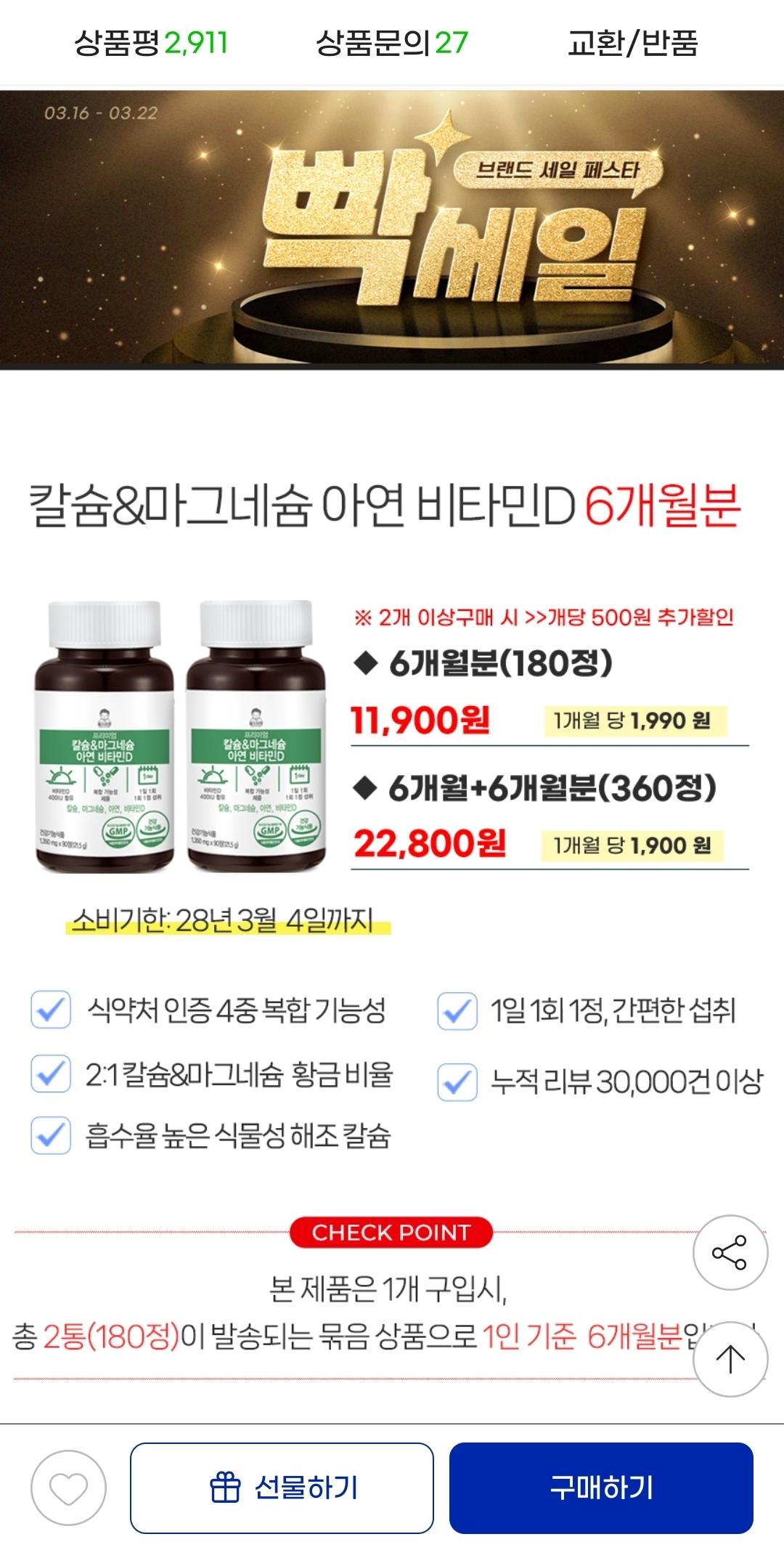 [지마켓] 칼슘 마그네슘 아연 비타민D 6개월분(180정) (11,900원/무배)