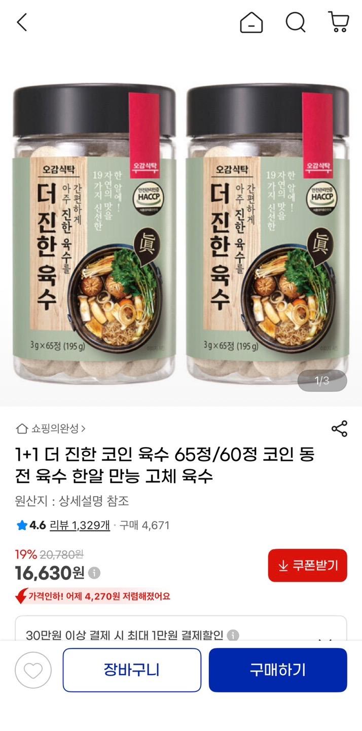 [지마켓] 더 진한 만능 코인 동전 육수 1+1 (16,630원/무배) > 국내핫딜