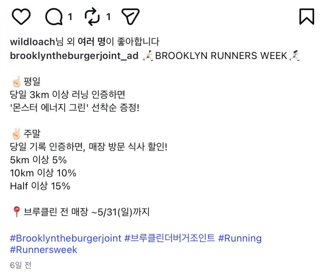 - 주말 5km이상 러닝 후 방문 인증시 10%할인