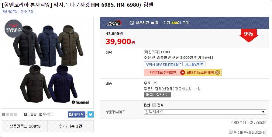 험멜 다운자켓이 쇼킹딜에 떴네요.