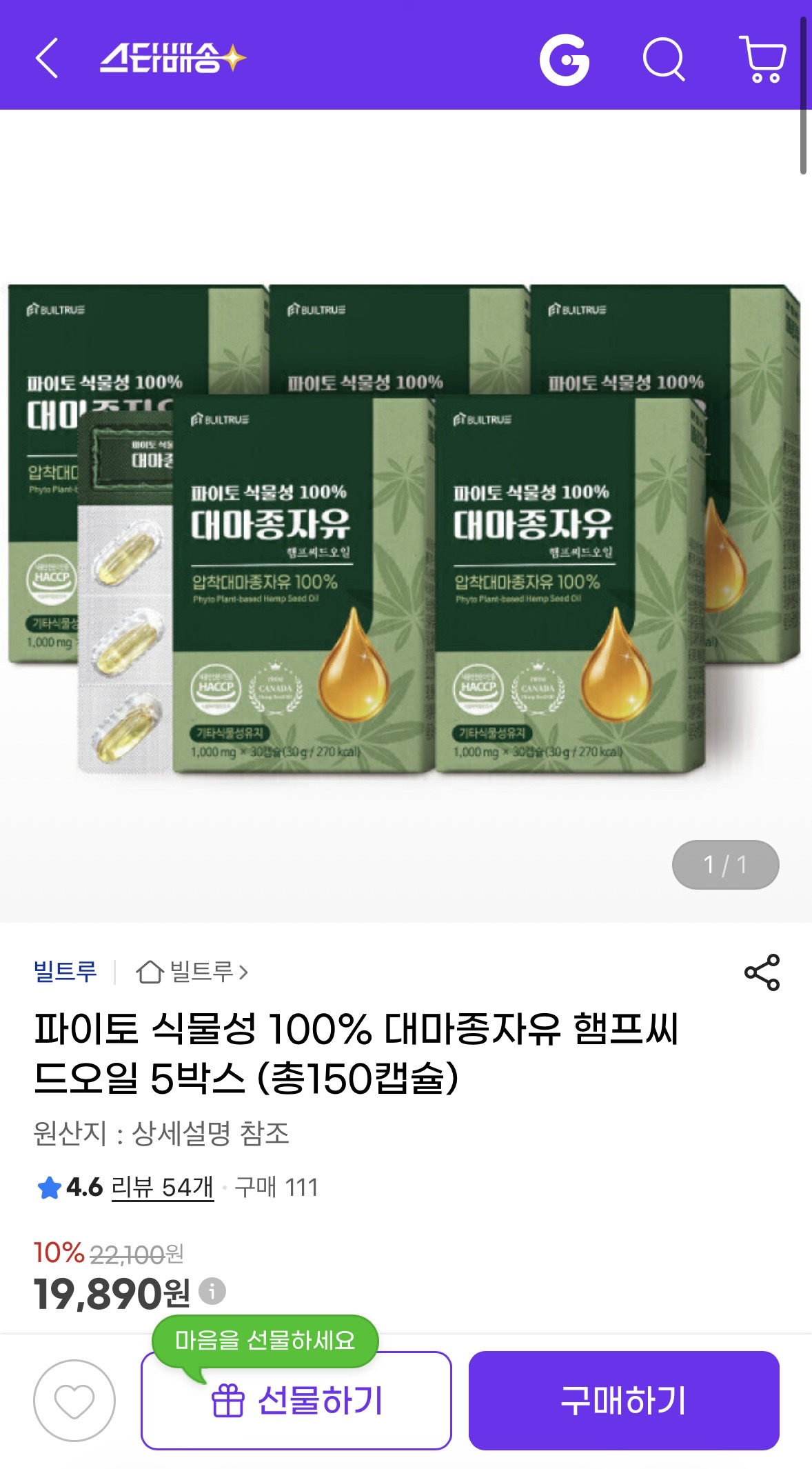 [지마켓] 파이토 식물성 100% 대마종자유 5박스 150캡슐 (19,890원/무배)