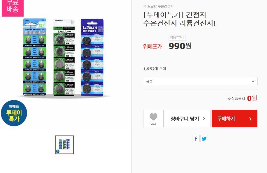 말이 필요업습니다 위메프 투데이특가로 수은,리튬 건전지가 990원에 무배로 팔고있습니다.