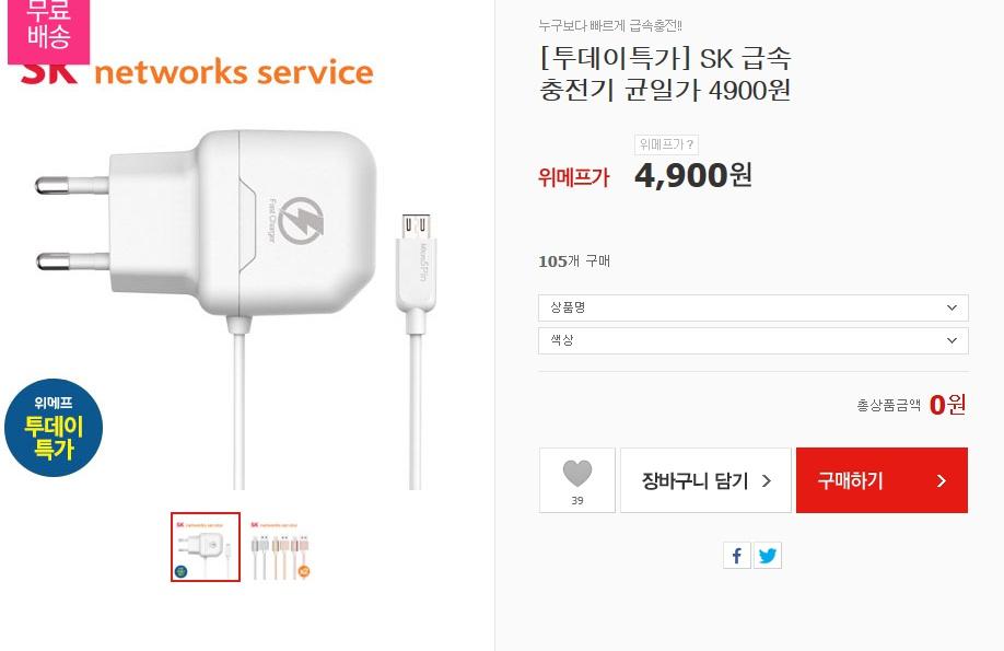 SK 모켓 케이블 일체형 퀵차지 2.0 급속충전기입니다. 4900원에 무배로 위메프 투데이 특가로 떳구요 퀵차지 2.0