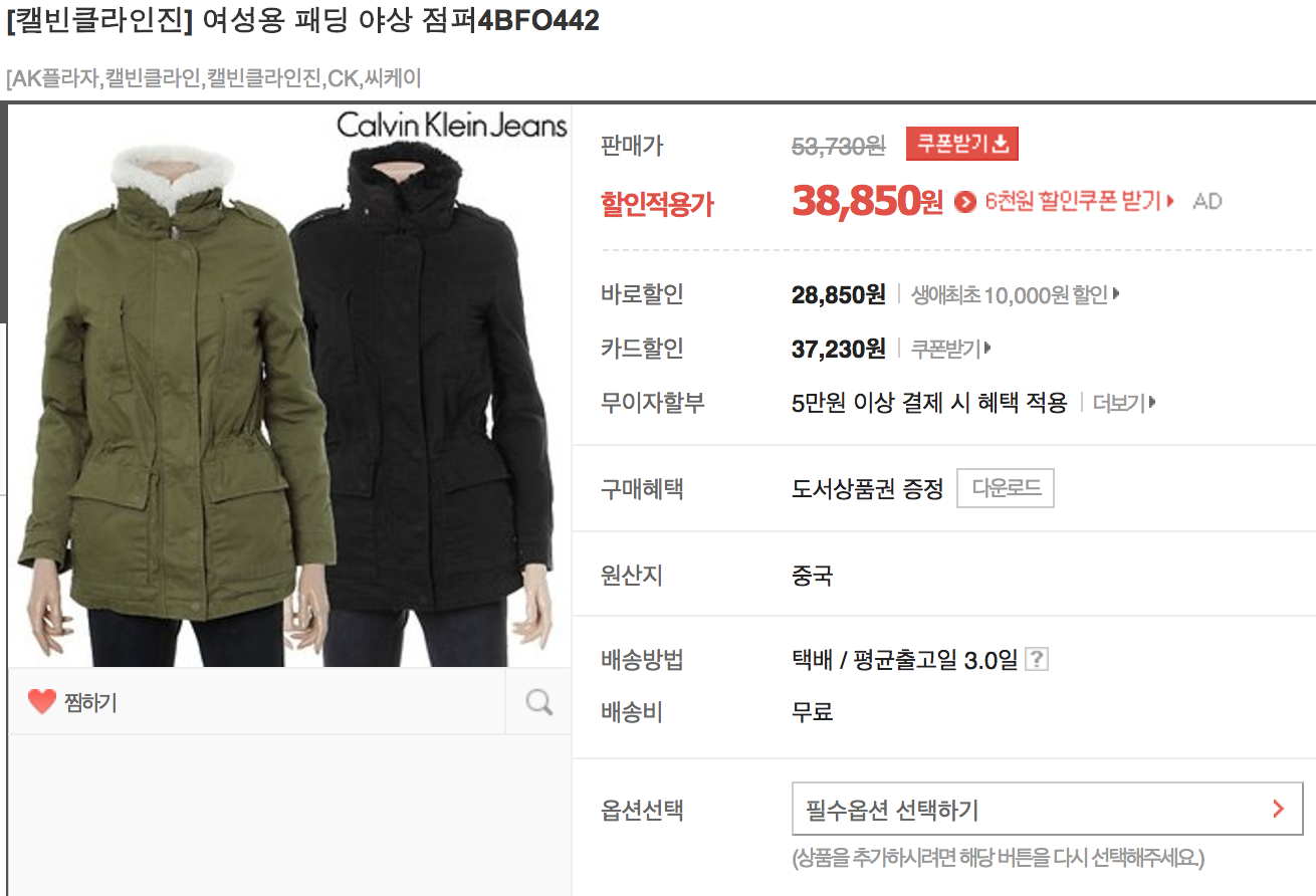 [인터파크] [캘빈클라인진] 여성용 패딩 야상 점퍼 (38,850/무료) > 국내핫딜