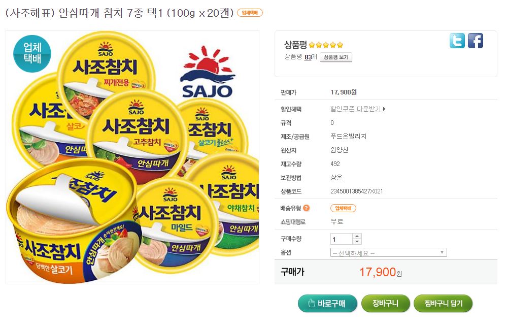 사조참치 100G짜리 종류는 여러가지(살코기, 고추, 마일드, 야채, 바베큐, 찌개용, 살코기플러스)고, 한가지씩 20캔 입니다. 추가금 없습니다.