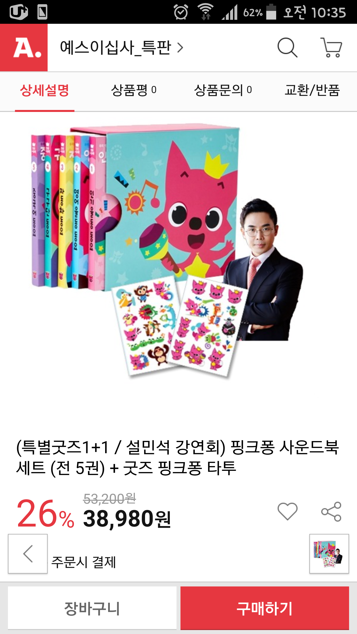 [옥션] 핑크퐁 사운드북 세트 (전 5권) +타투+설민석 강연권(27,280원/무배) > 국내핫딜