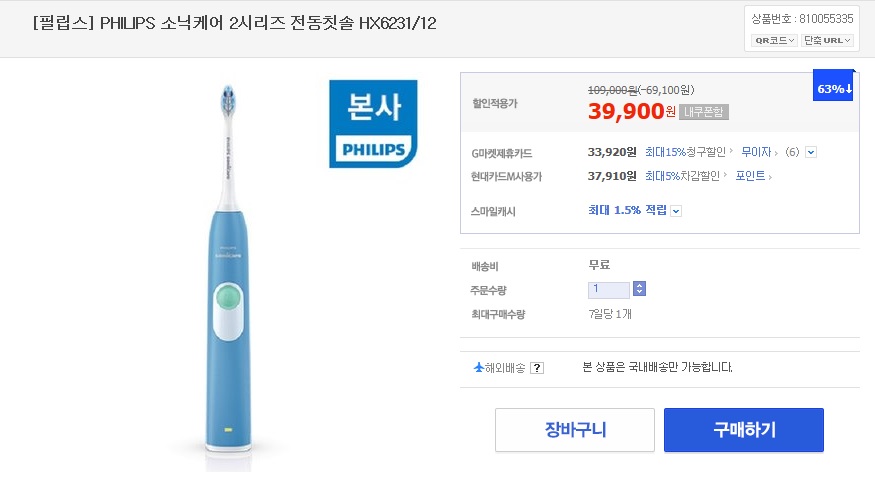 [G마켓] 필립스 소닉케어 2시리즈 전동칫솔 HX6231/12 (39,900원/무료) > 국내핫딜