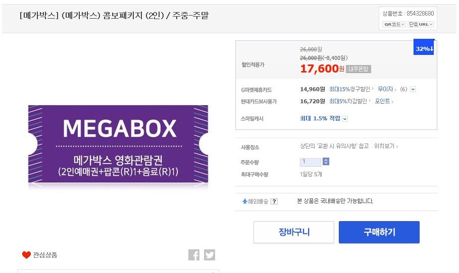 [지마켓] 메가박스 콤보패키지 2인/주중,주말 스마일페이결제 (17,600원/무료) > 국내핫딜
