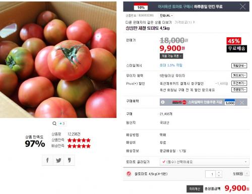 [옥션] 싱싱한 제철 토마토 4.5kg (9,900원/무료) > 국내핫딜