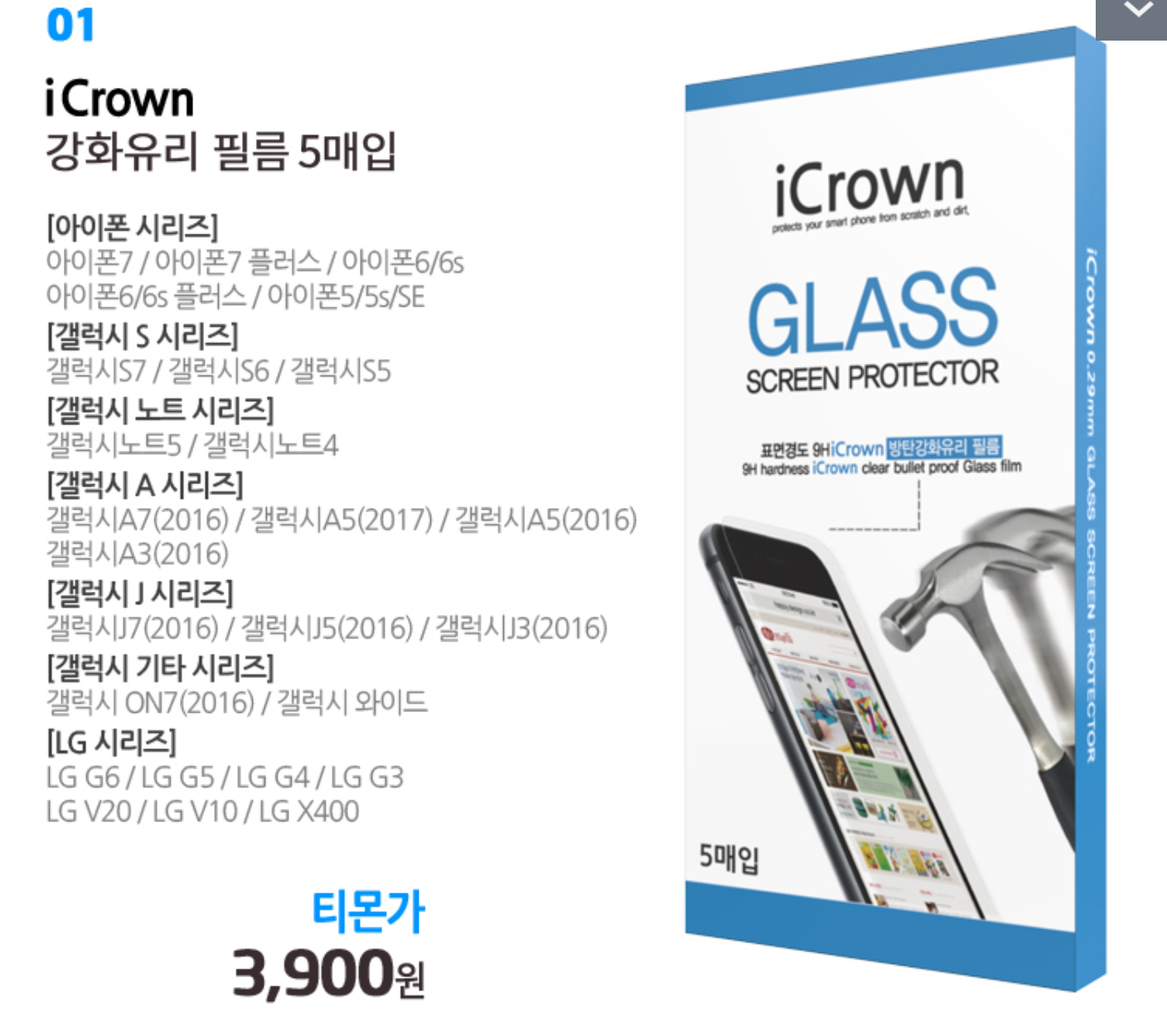 [티몬] 아이크라운 강화유리 5set (3,900원/0)