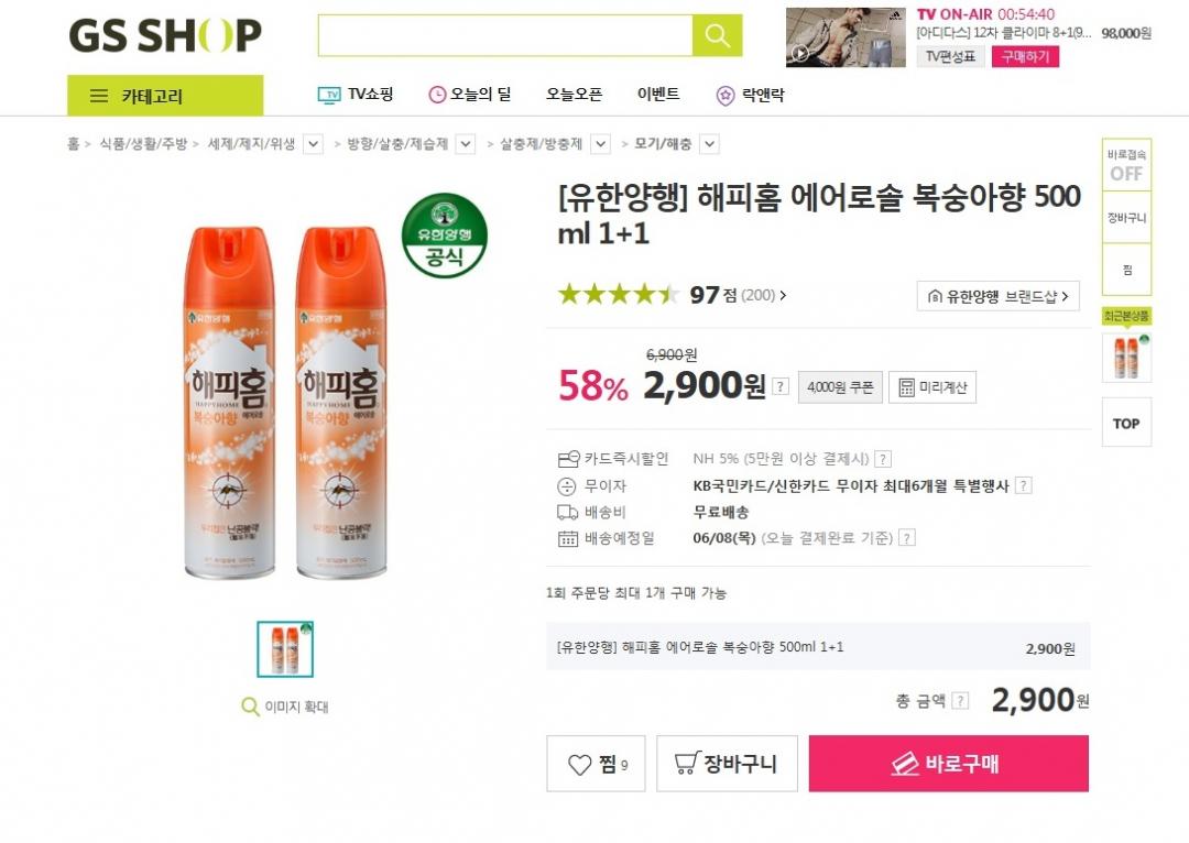 gsshop에서 해피홈 에어로솔 1+1 2900원 무배파네요.