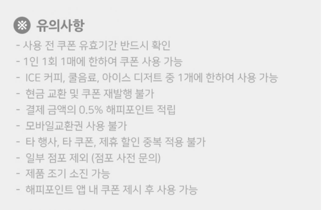 카톡,해피포인트 2개 받았는데 동시에 사용할 수 없나요? 아이스바 없는데 많다고 하니 찬음료 2천원 할인.. |