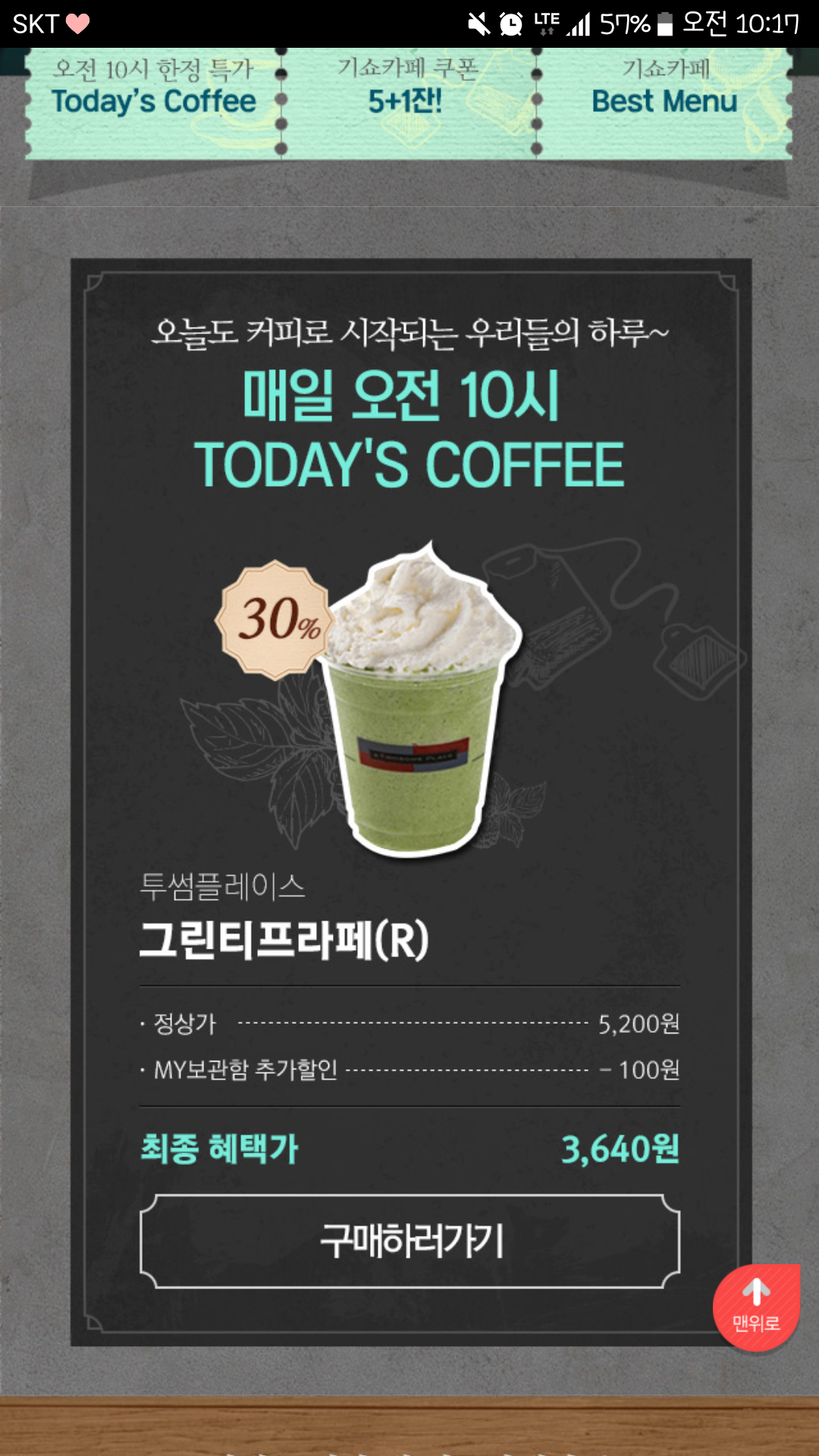 [기프티쇼] 투썸 그린티 프라페(보관함 구매시 3640/0) > 국내핫딜