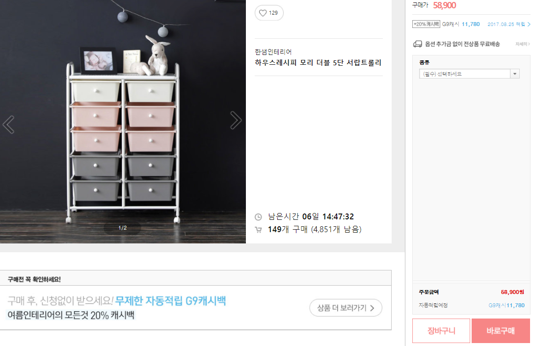 [G9] 한샘 5단 서랍트롤리 (58,900/무배) > 국내핫딜