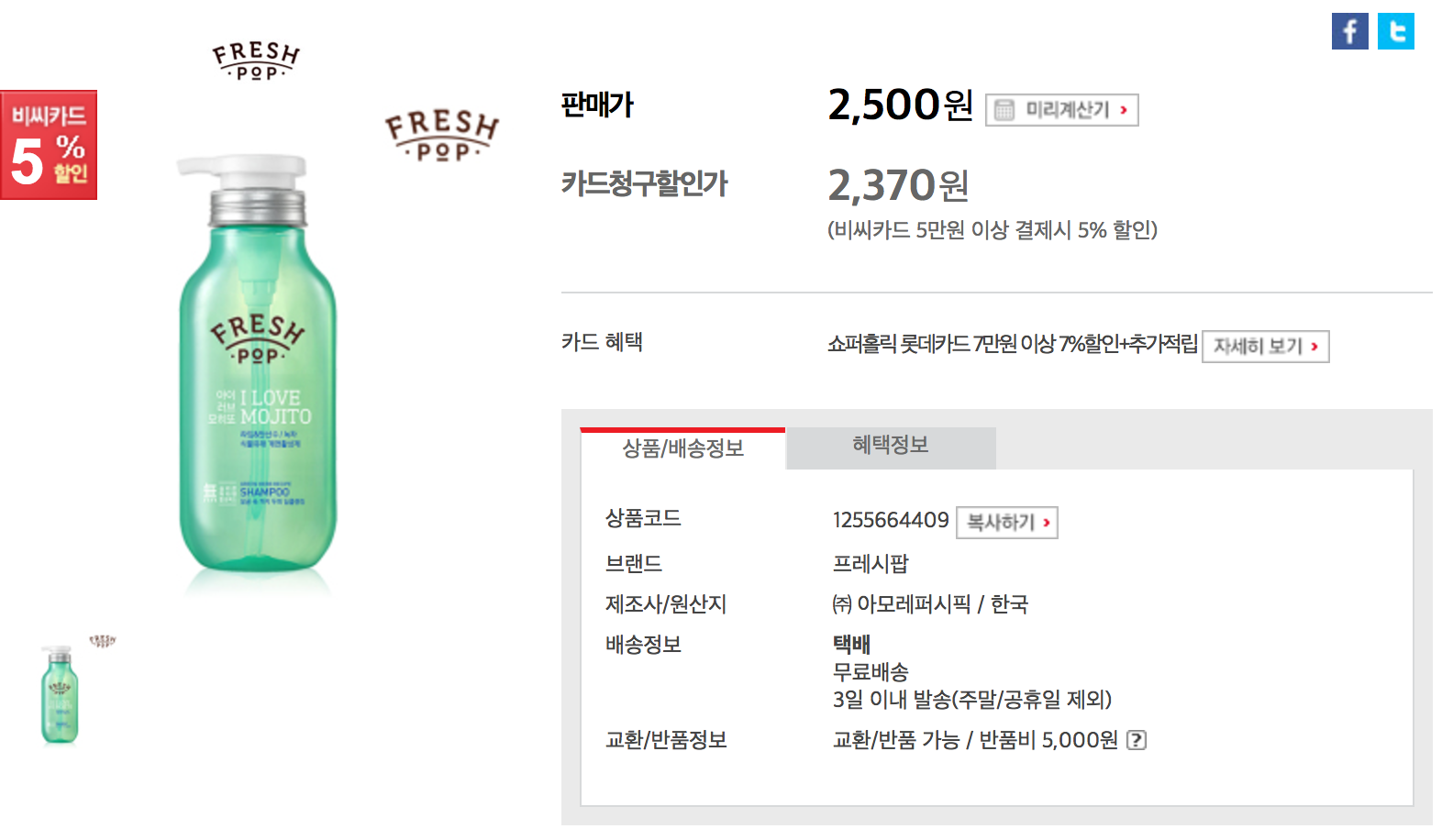 [롯데홈쇼핑] 프레시팝 모히또 샴푸 500ml (2,500원 / 무료)