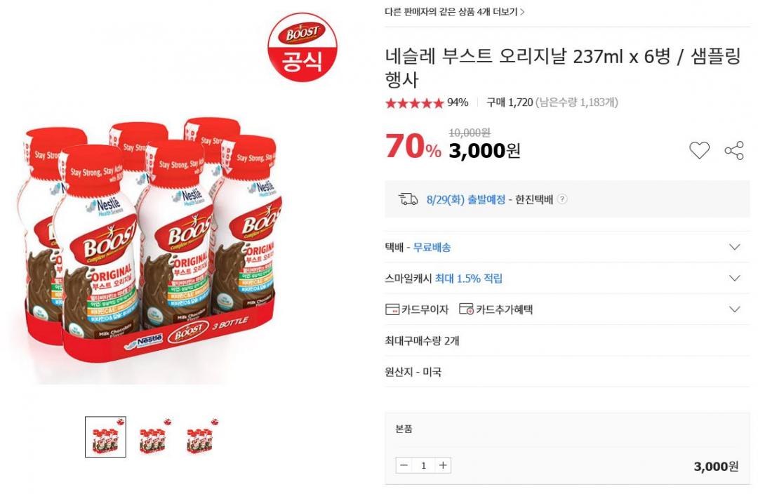 네슬레 부스트 오리지날 6개 무료배송 3,000원에 저렴하게 올라왔습니다.
