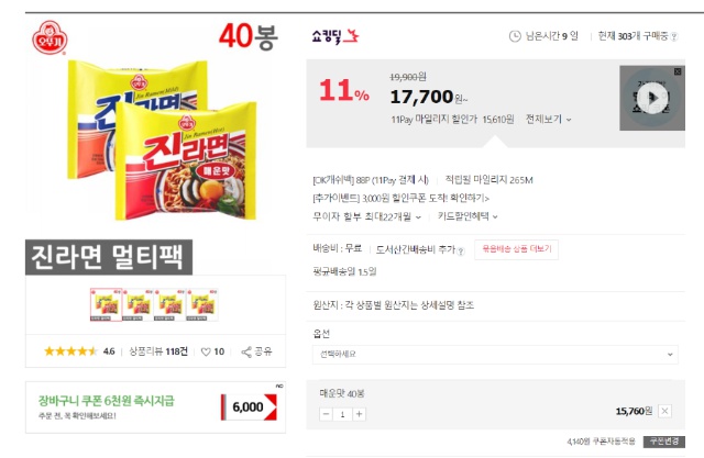 [11번가] 진라면 매운맛 40봉 (17,800/무배) 최종가 14,380