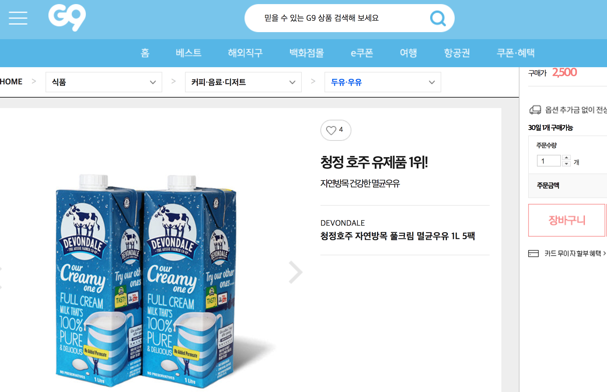 [G9] 청정호주 자연방목 풀크림 멸균우유 1L 5팩 (2500원/무료배송) > 국내핫딜