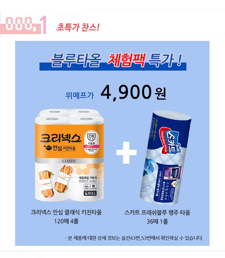 [위메프] 크리넥스 키친타올120매x4+블루타올36매 (4,900원/무료)