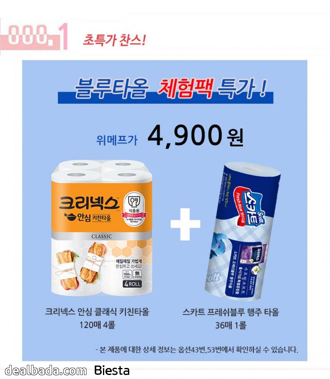 [위메프] 크리넥스 키친타올120매x4+블루타올36매 (4,900원/무료) > 국내핫딜
