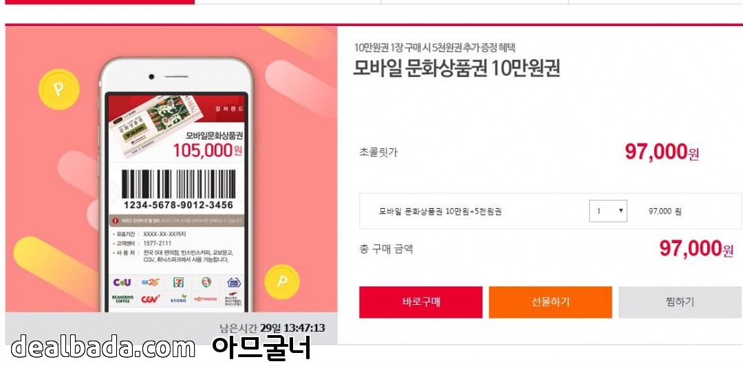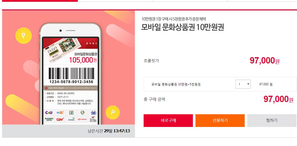 [SKT초콜릿] 컬쳐랜드 모바일 문화상품권10만원+5천원권 (97,000원/무료) > 국내핫딜