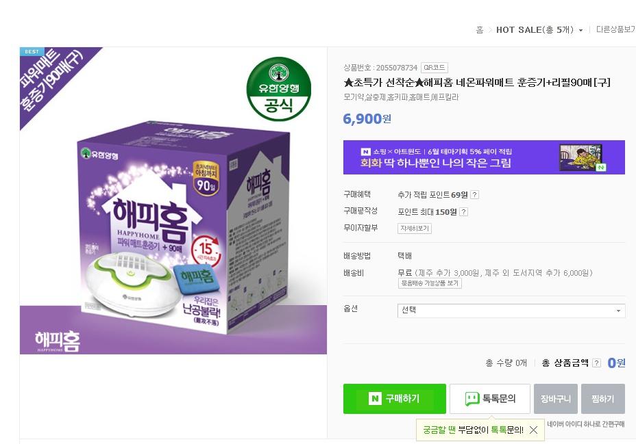 [네이버] 유한양행 해피홈 네온파워매트 훈증기+리필90매 (6,900/무료) > 국내핫딜
