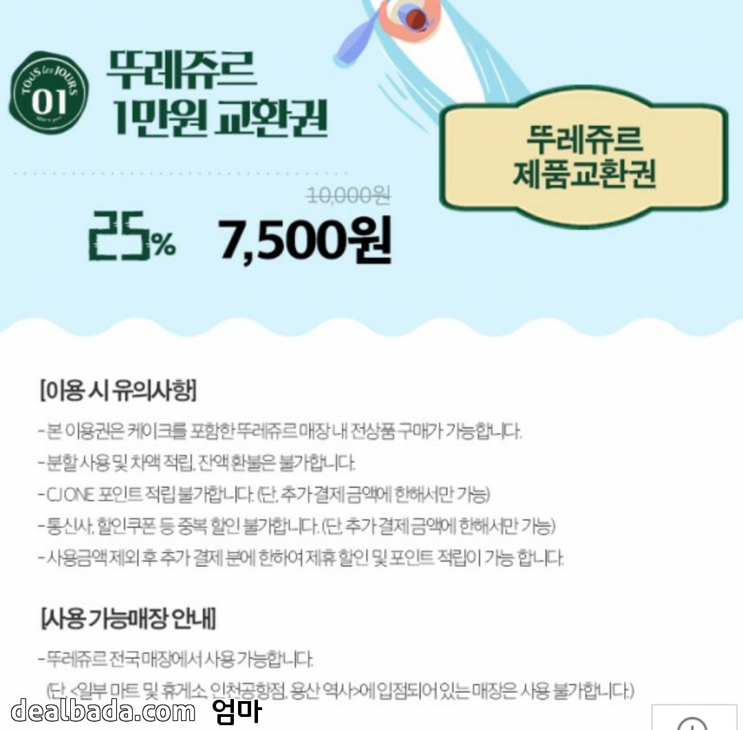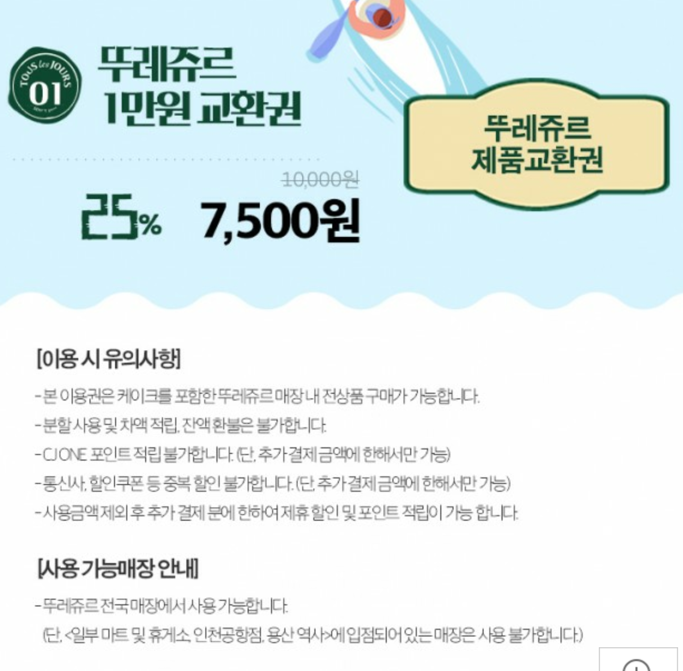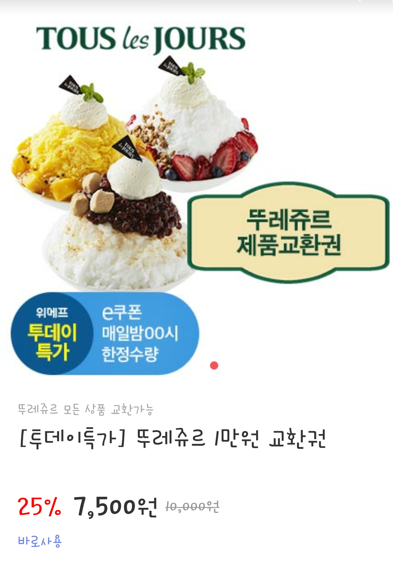 [위메프] 뚜레쥬르 1만원 교환권 (7,500원)