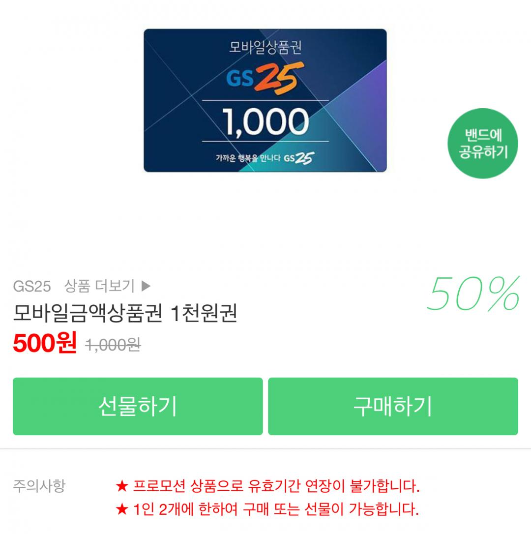 [밴드기프트샵] GS25 1천원 50% (500/무료)