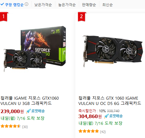 컬러풀 지포스 GTX 1060 IGAME VULCAN U OC D5 6G : 304,860