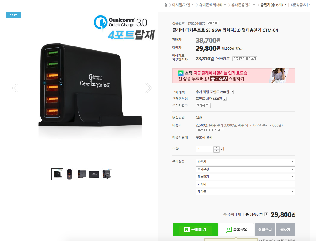 [네이버스토어] 클레버 타키온프로 SE 96W 퀵차지3.0 멀티충전기 CTM-04 (29,800/2,500)