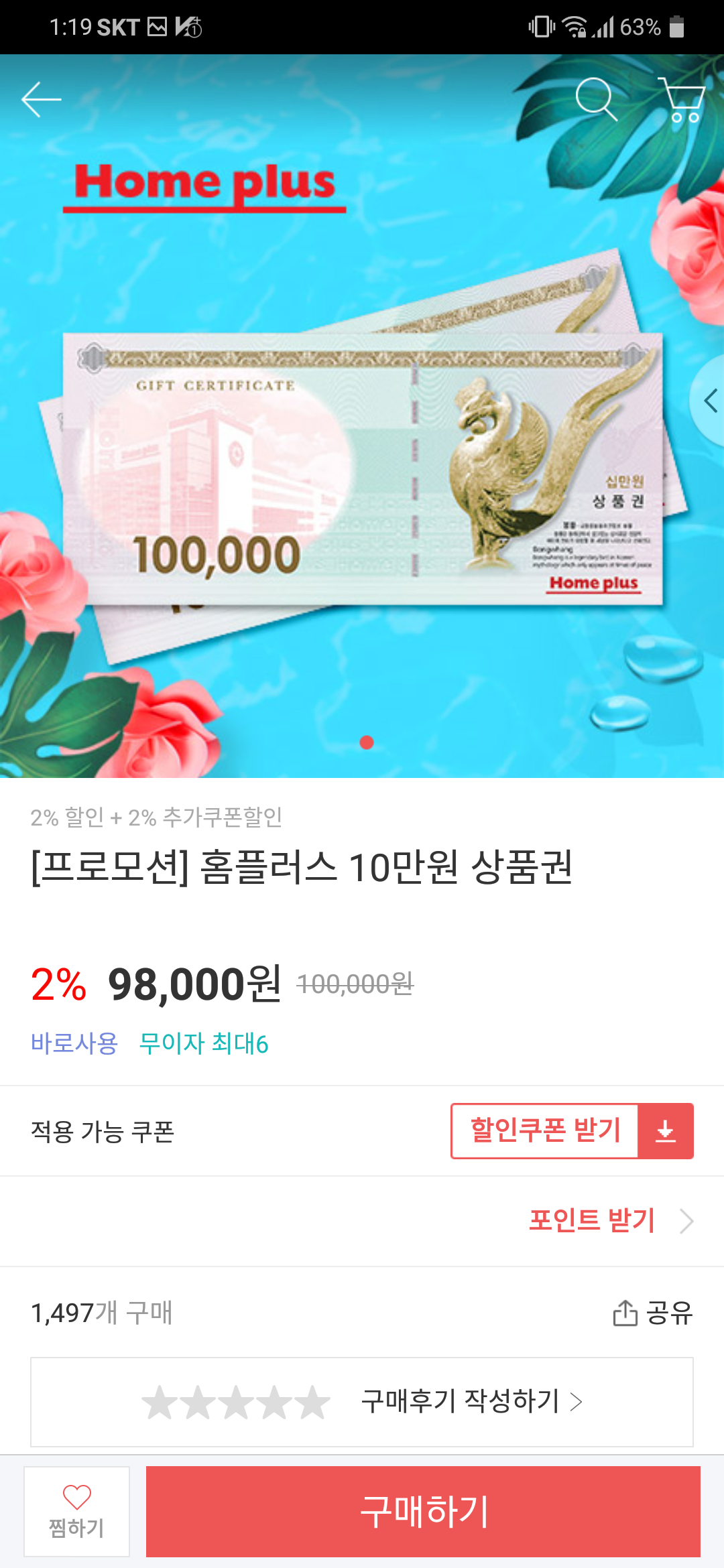 쿠폰 5번 사용가능하며 최대할인 금액이 10,000원이라서 한번에 5장까지만 결제해야 할인 유지할수 있습니다
