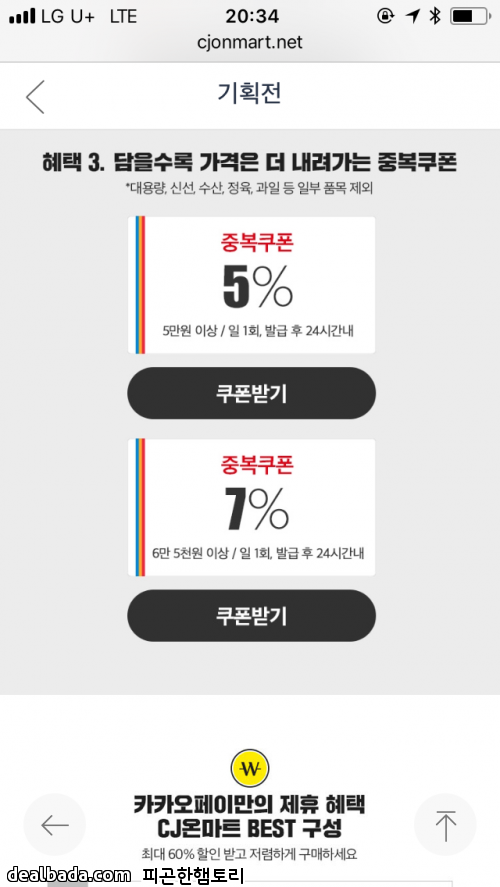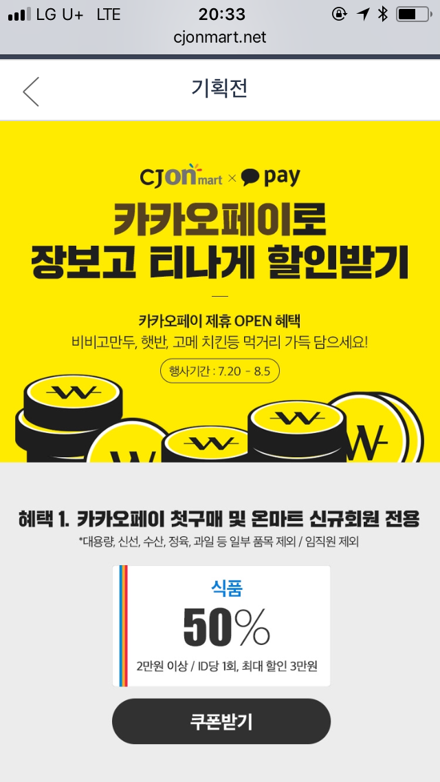 이후 메인 링크에 들어가셔서 카카오페이 전용 50% 쿠폰과 중복 5% 쿠폰을 받습니다
