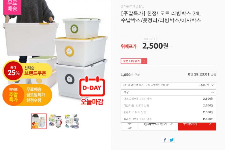 위메프에서 도트 리빙박스 24L를 2500원에 무료배송으로 팔고있습니다. 리방박스 필요하셧던분은 배송비 가격에